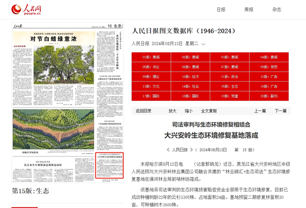 《人民日报》:司法审判与生态环境修复相结合 大兴安岭生态环境修复基地落成