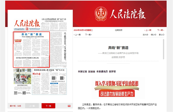 《人民法院报》头版报道:奔向“新”赛道 黑龙江法院助力老牌汽车企业转型升级