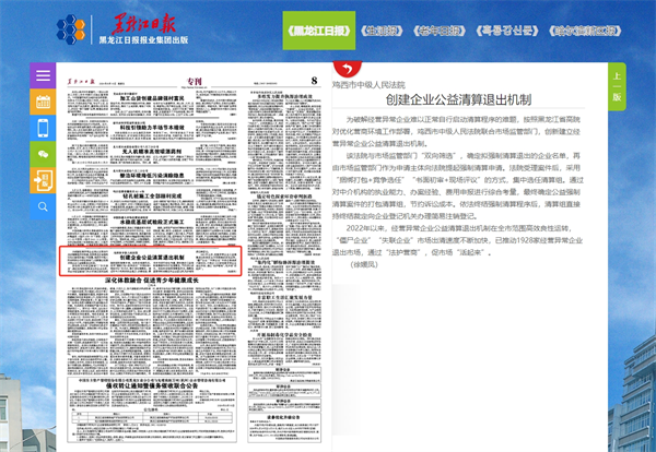 《黑龙江日报》:鸡西市中级人民法院 创建企业公益清算退出机制
