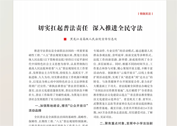 2023年以来,黑龙江法院聚焦“公正与效率”工作主题,以“一要二统三抓实”为工作思路,以“三争”晋先为工作总抓手,忠实履行宪法法律赋予的职责,坚持公正司法,狠抓提质增效,各项工作取得突出成效。近日,省委《奋斗》杂志刊发19篇稿件,全方位报道新时代新征程中全省法院始终牢记“国之大者”,不断回应社会关切的司法实践。今日,持续关注“奋斗吧!”专栏之十六黑龙江法院《切实扛起普法责任 深入推进全民守法》切实扛起普法责任 深入推进全民守法——黑龙江高院宣传信息处推进守法普法是全面依法治国的一项重要基础性工程。“八五”普法规划实施以来,黑龙江省高级人民法院(以下简称省法院)坚持以习近..