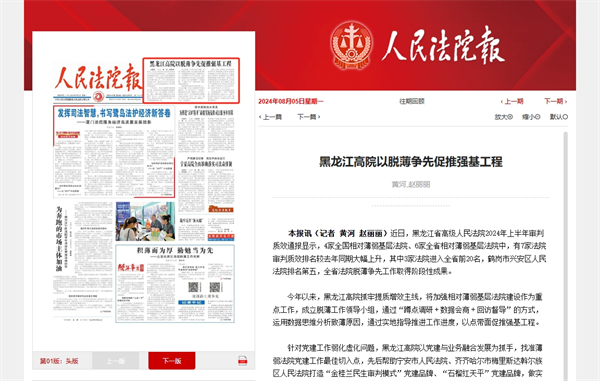 《人民法院报》头版报道:黑龙江高院以脱薄争先促推强基工程