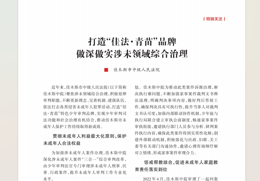 2023年以来,黑龙江法院聚焦“公正与效率”工作主题,以“一要二统三抓实”为工作思路,以“三争”晋先为工作总抓手,忠实履行宪法法律赋予的职责,坚持公正司法,狠抓提质增效,各项工作取得突出成效。近日,省委《奋斗》杂志刊发19篇稿件,全方位报道新时代新征程中,全省法院始终牢记“国之大者”不断回应社会关切的司法实践。今日,持续关注“奋斗吧!”专栏之十五黑龙江法院《打造“佳法·青苗”品牌 做深做实涉未领域综合治理》《打造“佳法·青苗”品牌做深做实涉未领域综合治理》——佳木斯中院近年来,佳木斯市中级人民法院(以下简称佳木斯中院)聚焦涉未领域综合治理,积极延伸审判职能,不断更新理念..