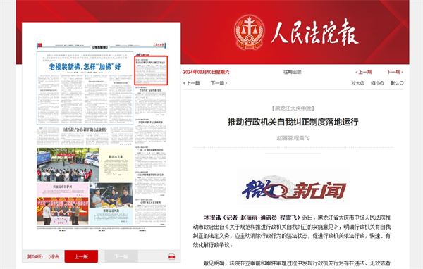 《人民法院报》:【黑龙江大庆中院】 推动行政机关自我纠正制度落地运行