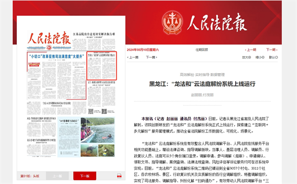 《人民法院报》头版报道:黑龙江 “龙法和”云法庭解纷系统上线运行