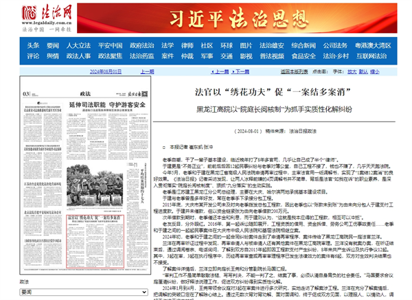 《法治日报》:法官以“绣花功夫”促“一案结多案消” 黑龙江高院以“院庭长阅核制..