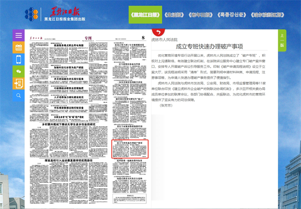 《黑龙江日报》:虎林市人民法院 成立专班快速办理破产事项