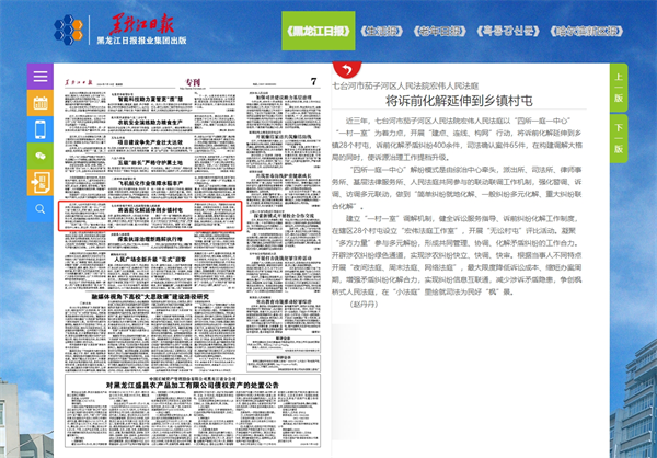 《黑龙江日报》:七台河市茄子河区人民法院宏伟人民法庭 将诉前化解延伸到乡镇村屯