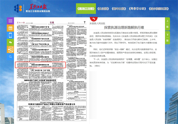 《黑龙江日报》:友谊县人民法院 探索执源治理新路解执行难