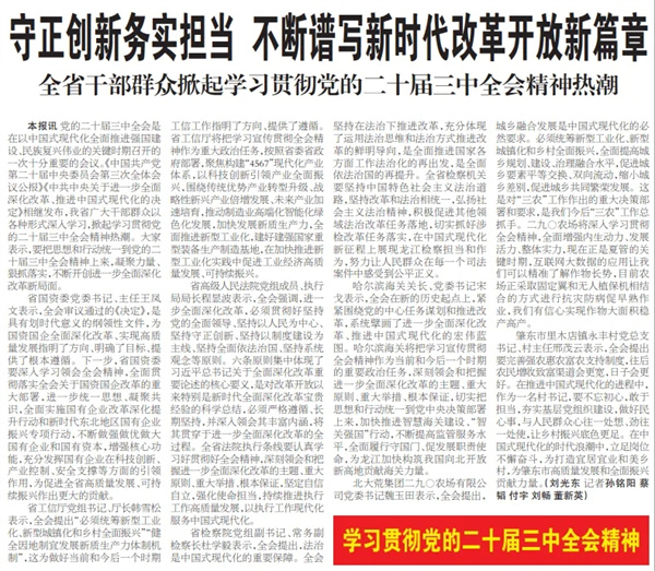党的二十届三中全会是在以中国式现代化全面推进强国建设、民族复兴伟业的关键时期召开的一次十分重要的会议。《中国共产党第二十届中央委员会第三次全体会议公报》《中共中央关于进一步全面深化改革、推进中国式现代化的决定》相继发布,我省广大干部群众以各种形式深入学习,掀起学习贯彻党的二十届三中全会精神热潮。大家表示,要把思想和行动统一到党的二十届三中全会精神上来,凝聚力量、狠抓落实,不断开创进一步全面深化改革新局面。黑龙江高院党组成员、执行局局长程显波表示,全会强调,进一步全面深化改革,必须贯彻好坚持党的全面领导、坚持以人民为中心、坚持守正创新、坚持以制度建设为主线、坚持全面依法治国、坚持系统观念..