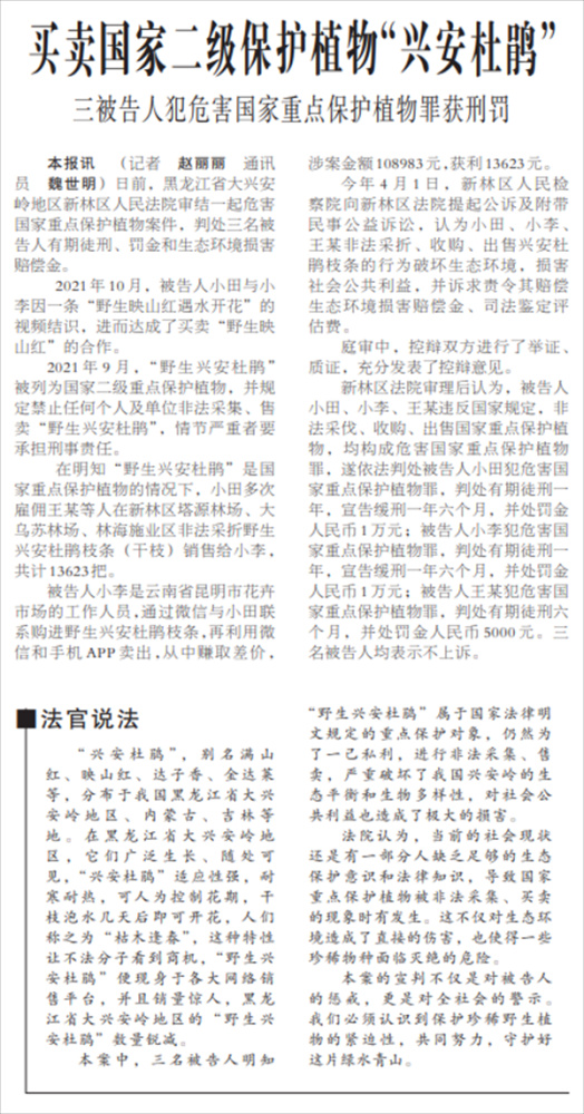 《人民法院报》:买卖国家二级保护植物“兴安杜鹃” 三被告人犯危害国家重点保护植..