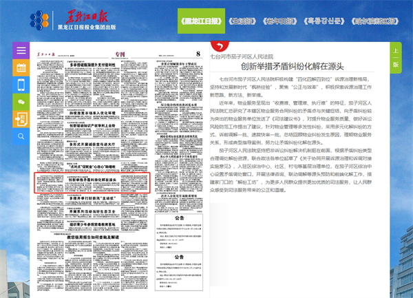 《黑龙江日报》:七台河市茄子河区人民法院 创新举措矛盾纠纷化解在源头