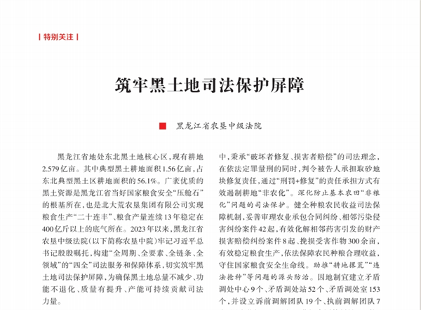 2023年以来,黑龙江法院聚焦“公正与效率”工作主题,以“一要二统三抓实”为工作思路,以“三争”晋先为工作总抓手,忠实履行宪法法律赋予的职责,坚持公正司法,狠抓提质增效,各项工作取得突出成效。近日,省委《奋斗》杂志刊发19篇稿件,全方位报道新时代新征程中全省法院始终牢记“国之大者”,不断回应社会关切的司法实践。今日,持续关注“奋斗吧!”专栏之八,黑龙江法院筑牢黑土地司法保护屏障。筑牢黑土地司法保护屏障——黑龙江省农垦中级法院黑龙江省地处东北黑土地核心区,现有耕地2.579亿亩。其中典型黑土耕地面积1.56亿亩,占东北典型黑土区耕地面积的56.1%。广袤优质的黑土资源是黑龙江省当好国家粮食..