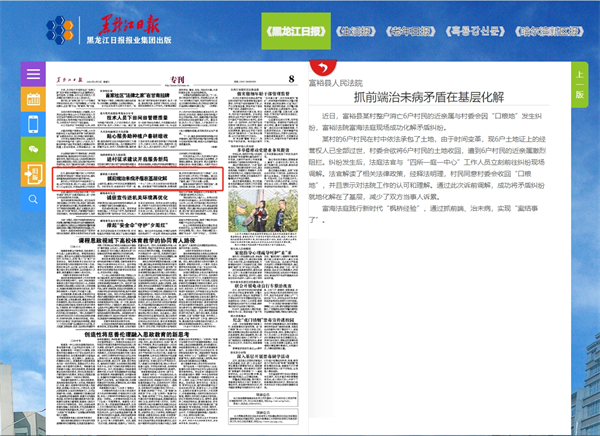 《黑龙江日报》:富裕县人民法院 抓前端治未病矛盾在基层化解