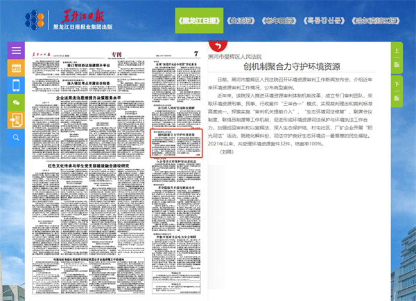 《黑龙江日报》:黑河市爱辉区人民法院 创机制聚合力守护环境资源
