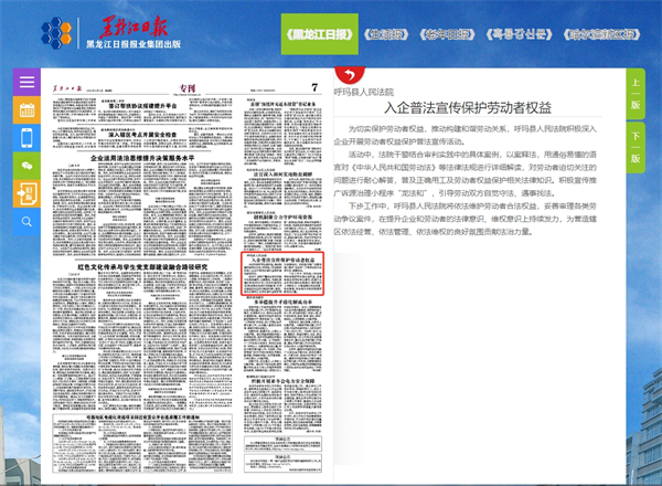 《黑龙江日报》:呼玛县人民法院 入企普法宣传保护劳动者权益