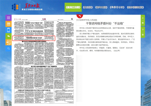 《黑龙江日报》:大兴安岭呼中区人民法院 干警进网格矛盾纠纷“不出格”