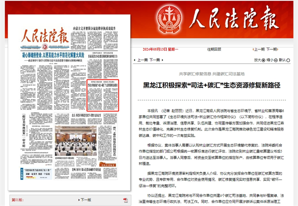 《人民法院报》头版报道:共享碳汇修复信息 共建碳汇司法基地 黑龙江积极探索“司法..