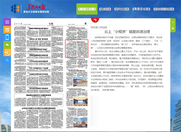 《黑龙江日报》:克东县人民法院 云上“小程序”赋能诉源治理