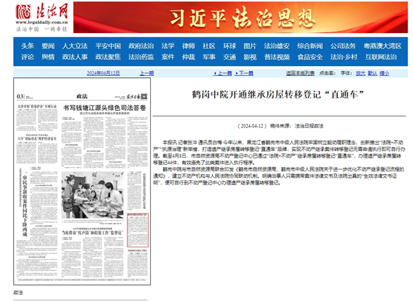 《法治日报》:鹤岗中院开通继承房屋转移登记“直通车”