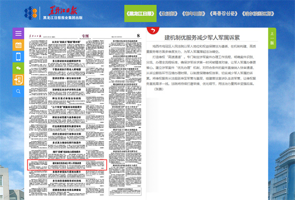 《黑龙江日报》报道鸡西市鸡冠区法院:建机制优服务减少军人军属诉累