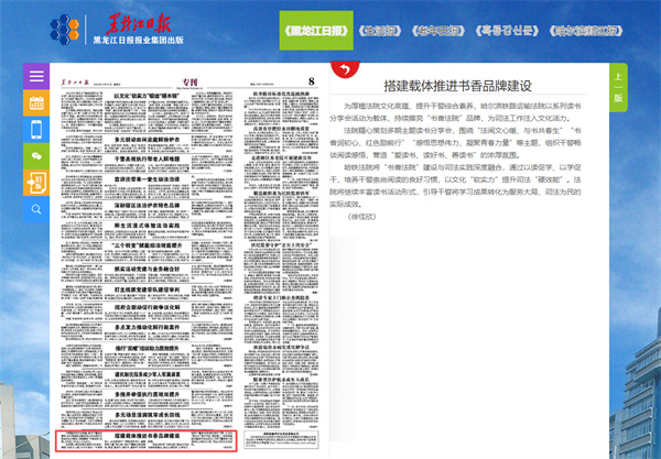 《黑龙江日报》报道哈铁法院:搭建载体推进书香品牌建设
