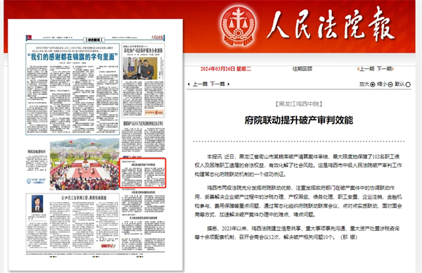 《人民法院报》:黑龙江鸡西中院 府院联动提升破产审判效能