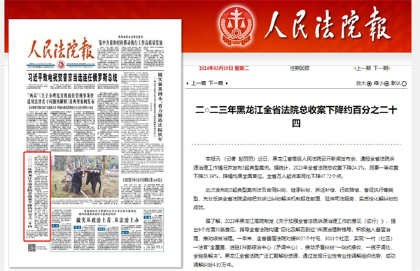 《人民法院报》头版报道:二0二三年黑龙江全省法院总收案下降约百分之二十四