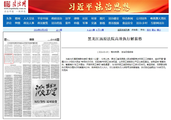 《法治日报》:黑龙江汤原法院高效执行解薪愁