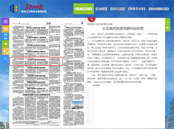 《黑龙江日报》:勃利县人民法院青山法庭 公正裁判实质性解纠纷获赞