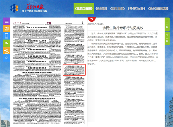 《黑龙江日报》:虎林市人民法院 涉民生执行专项行动见实效