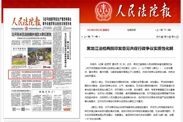 《人民法院报》头版报道:黑龙江法检两院印发意见共促行政争议实质性化解