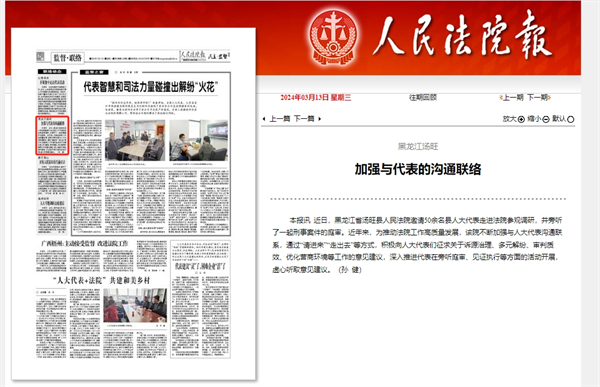 《人民法院报》:黑龙江汤旺 加强与代表的沟通联络