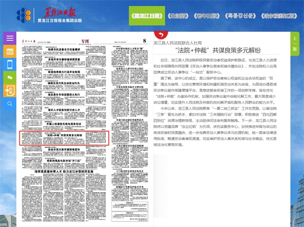《黑龙江日报》:龙江县人民法院联合人社局 “法院+仲裁”共谋良策多元解纷