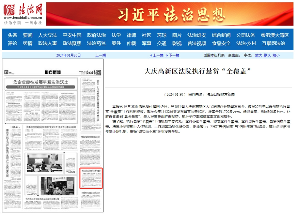 《法治日报》:大庆高新区法院执行悬赏“全覆盖”