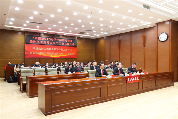 1月30日,黑龙江省高级人民法院举行“雷霆2024”执行行动启动仪式暨涉民生案件农民工工资兑现大会。黑龙江高院党组书记、院长党广锁出席会议并发布启动令。会议要求,全省各级法院要进一步统一思想、振奋精神,充分发挥党领导人民法院工作的政治优势和执行工作统一管理的制度优势,坚持上下联动、同频共振、齐心协力,把“雷霆2024”执行行动作为贯穿全年执行工作的重要行动和中心任务。在突出对抗拒执行、规避执行、违法干预执行“零容忍”的同时,进一步强化善意文明执行理念,在案件办理中既体现“司法力度”,也彰显“司法温度”,实现案件成功执结、企业平稳发展、职工端住“饭碗”的双赢多赢共赢效果,为龙江高质量发展可持续振兴..