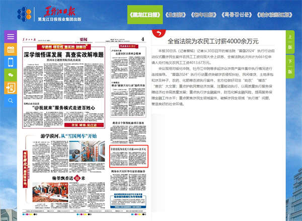《黑龙江日报》:全省法院为农民工讨薪4000余万元