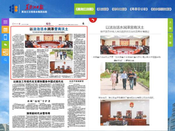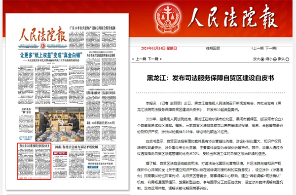 《人民法院报》头版报道:黑龙江:发布司法服务保障自贸区建设白皮书