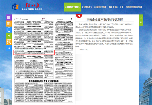 《黑龙江日报》报道伊春中院:完善企业破产审判制度促发展