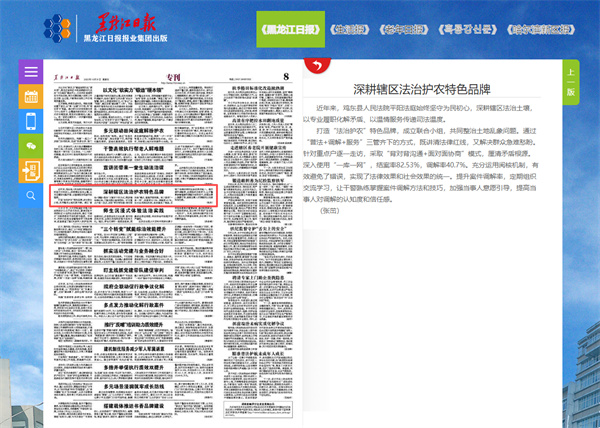 《黑龙江日报》报道鸡东县法院:深耕辖区法治护农特色品牌
