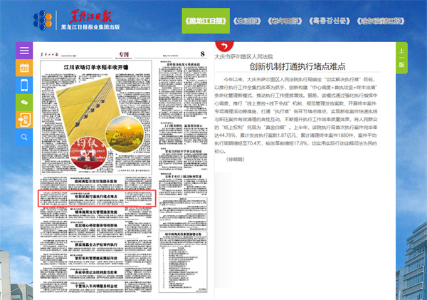 《黑龙江日报》:大庆市萨尔图区人民法院 创新机制打通执行堵点难点