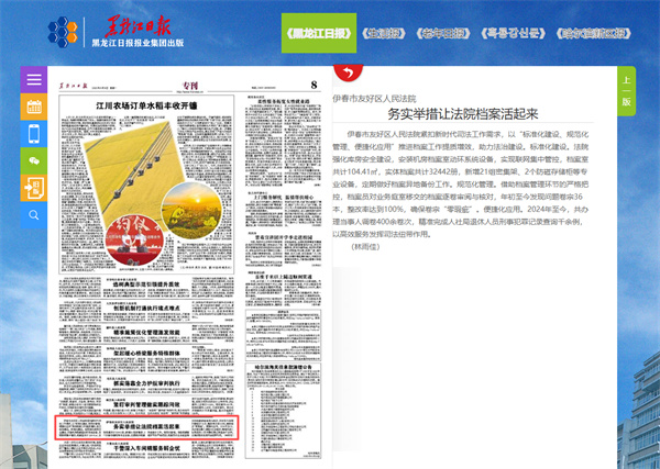 《黑龙江日报》:伊春市友好区人民法院 务实举措让法院档案活起来