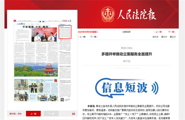 《人民法院报》:黑龙江鸡东 多措并举推动立案服务全面提升