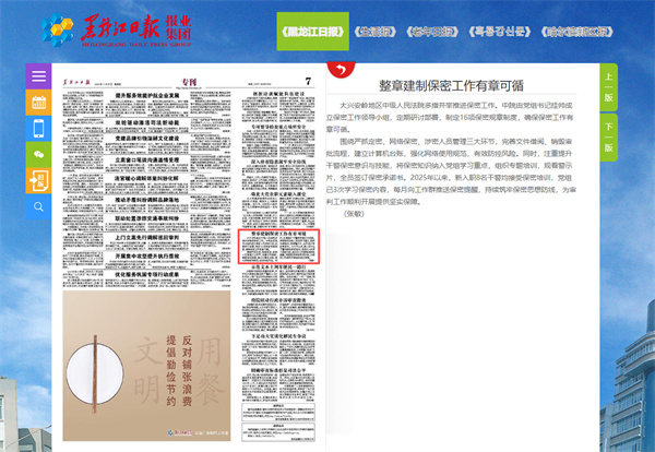《黑龙江日报》报道大兴安岭中院:整章建制保密工作有章可循