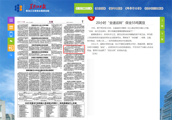 《黑龙江日报》报道呼玛县法院:20小时“全速运转”保全55吨黄豆