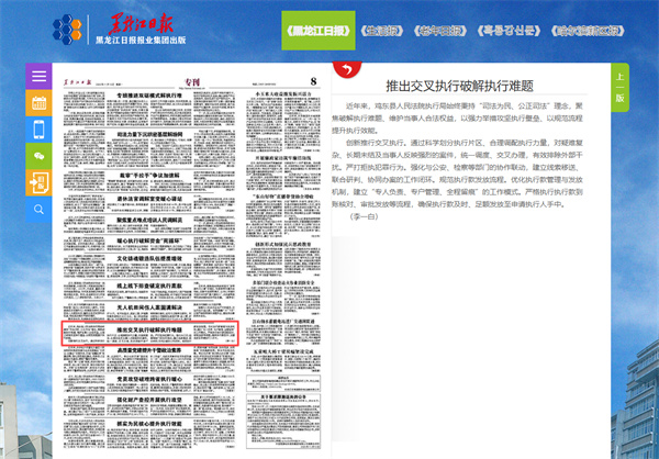 《黑龙江日报》报道鸡东县法院:推出交叉执行破解执行难题