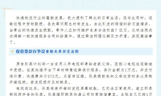 快递物流行业的蓬勃发展,极大便利了群众的日常生活。但与此同时,运输过程中货物毁损、丢失等问题也时有发生,由此引发的赔偿纠纷日益增多。当寄出的快递发生损毁,寄件人应如何维护自身合法权益?近日,绥化市北林区法院成功调解一起快递服务合同纠纷案件,通过释法明理化解双方矛盾,实现案结事了。保价条款存争..