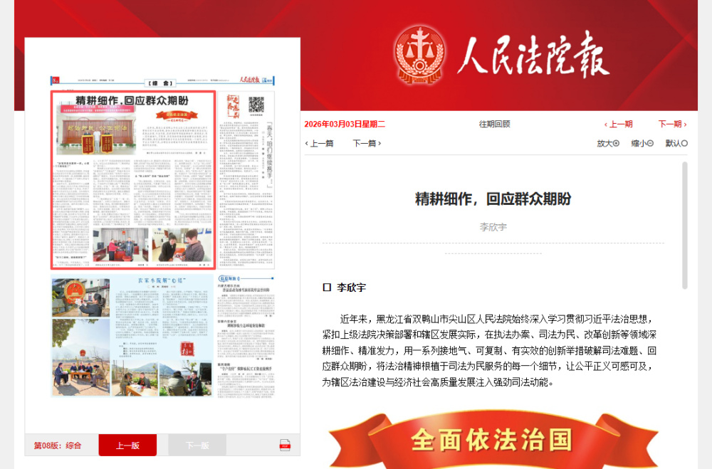 《人民法院报》报道双鸭山市尖山区法院:精耕细作 回应群众期盼